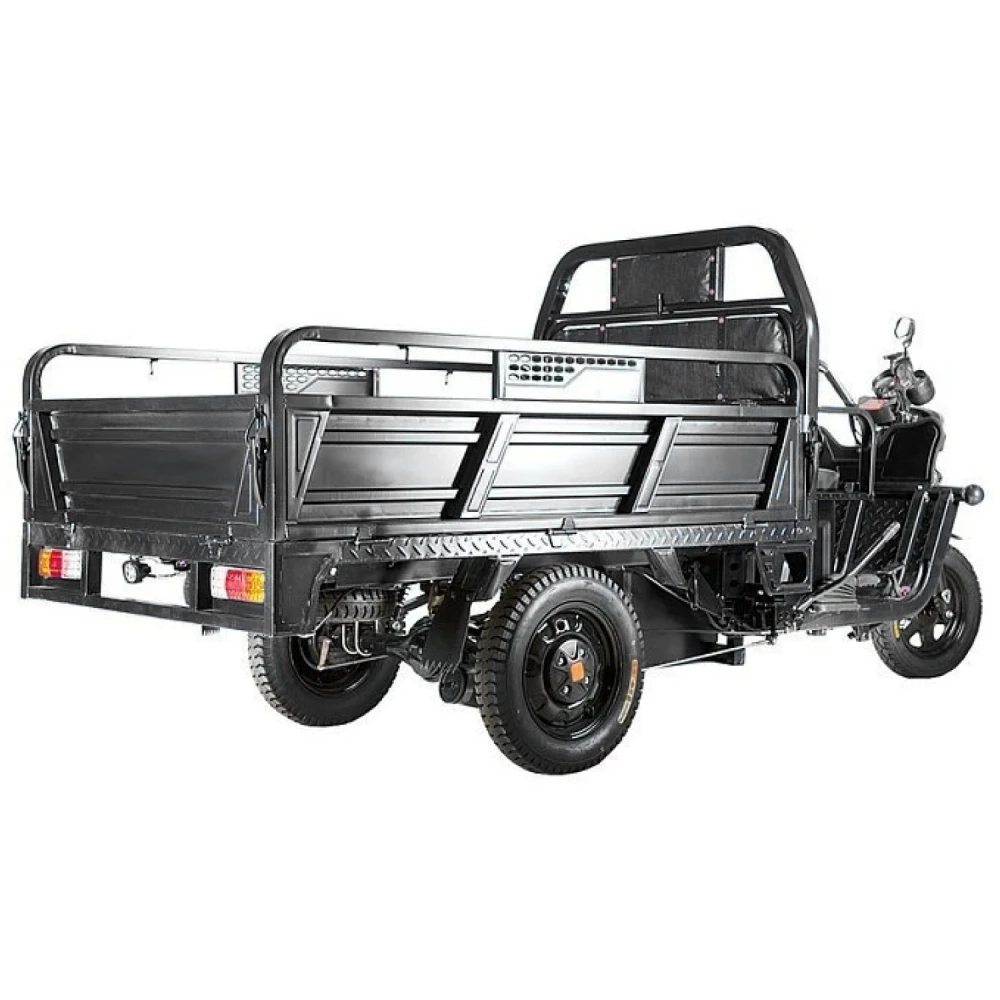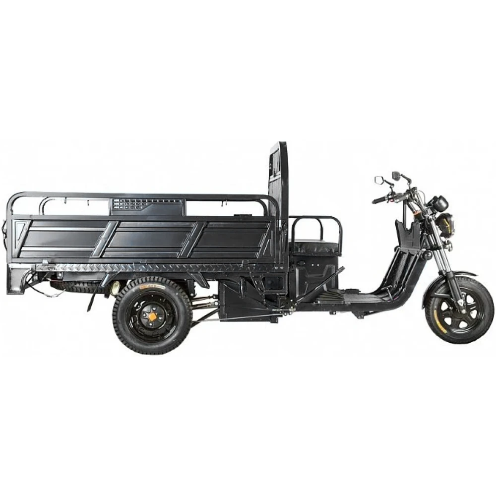 Грузовой электротрицикл Rutrike D4 1800 60V1200W черный – выглядит мощно и серьезно. Впечатляет дизайном. Модель рассчитана на предприимчивых личностей, занимающихся коммерцией или имеющих огороднический участок. Приобрести тс по цене производителя в оперативном режиме позволит сотрудничество с нашим интернет-магазином. Стальная конструкция электротрицикла прочная и надежная, выдерживает максимальную грузоподъемность до 1 тонны или вес 10 взрослых человек.