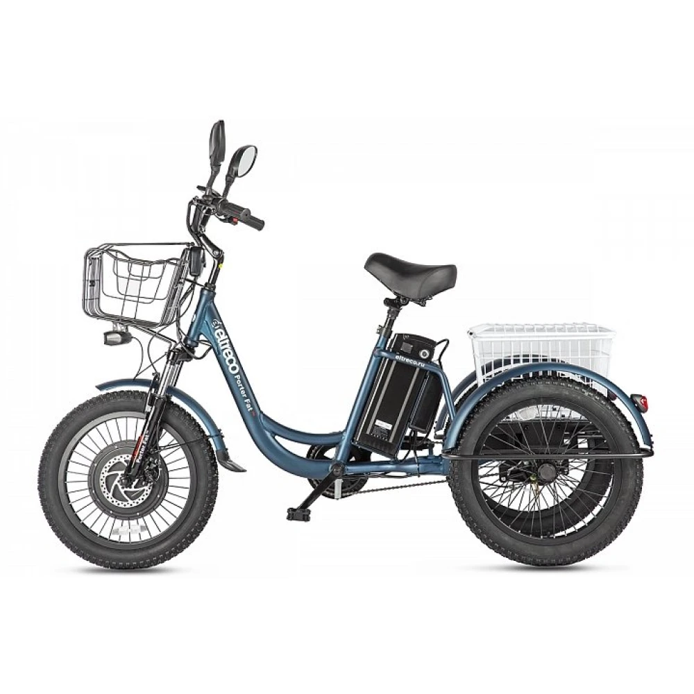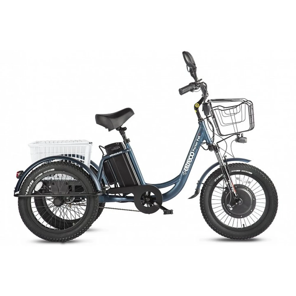 Трицикл Eltreco Porter Fat 500 Темно-синий – стал хитом сезона 2021. Мечты райдеров сбылись вместе с выходом новой модели. Трехколесный грузовой трицикл с мощным двигателем (500 Вт) станет помощником по дому. Объемная задняя корзина, немного меньшая передняя эффективны при транспортировке мелких бытовых предметов, работах на дачном участке, прогулок на свежем отдыхе с семьей и друзьями. Наличие электровелосипеда высвободит руки и время на выполнение работы.