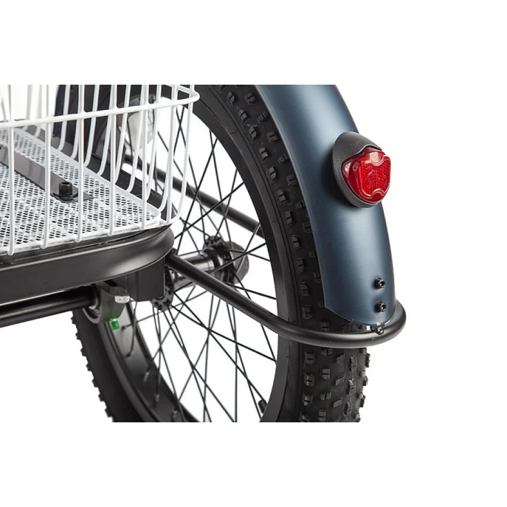 Из преимущественных особенностей электровелосипеда стоит отметить емкую литий-ионную батарею, рассчитанную на 40 км пути. Скоростные характеристики трехколесного электробайка – 30 км/час. Мощная колесная часть оснащена шинами 20"х3.0", имеет двойные алюминиевые обода, препятствующие образованию восьмерки. Максимальные параметры грузоподъемности – 120 кг.