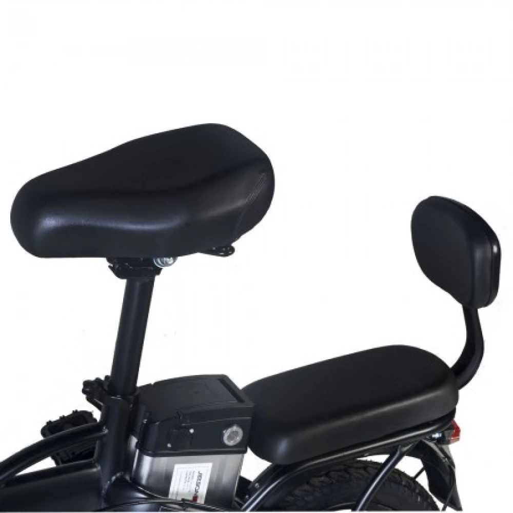 Мощность электромотора 350 Вт и емкости батареи – 12 А*ч достаточно для развития приличной скорости – до 45 км/час и преодоления расстояния до 42 км пути. Байк оснащен механическими тормозами и 14-дюймовыми накатистыми колесами. Батарея размещена за подседельной частью в специальном блоке. Надежно спрятана от негативных воздействия погодных факторов.