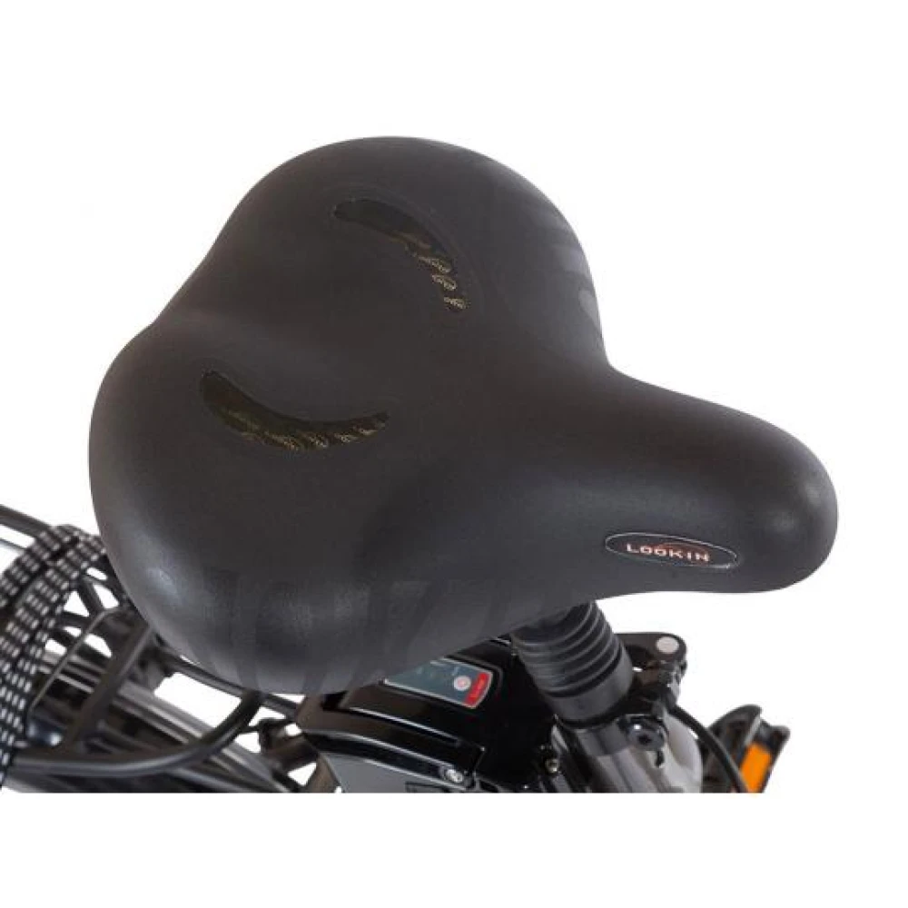 Электровелосипед Eltreco Jazz VIP имеет багажник, световое освещение, информационный дисплей, на котором можно посмотреть основные показатели, такие как скорость, уровень заряда батареи и пройденный путь.