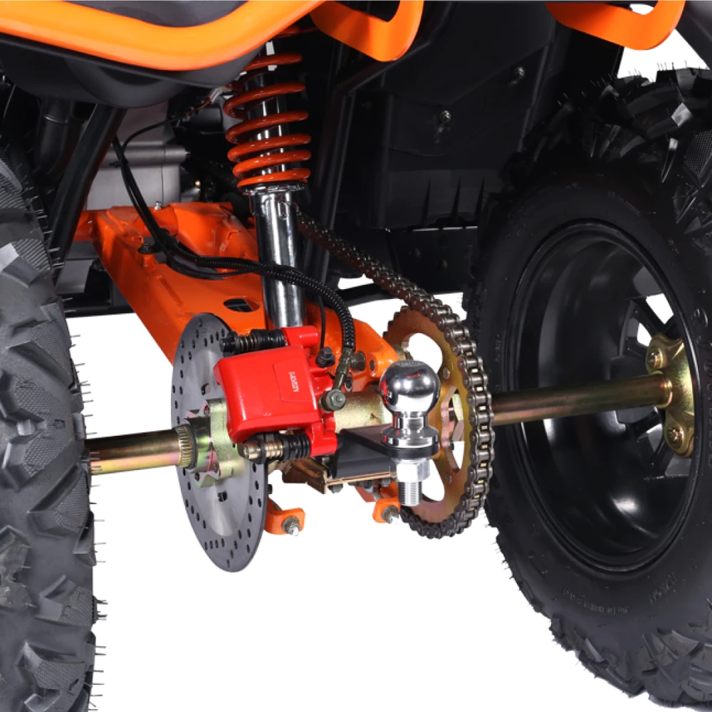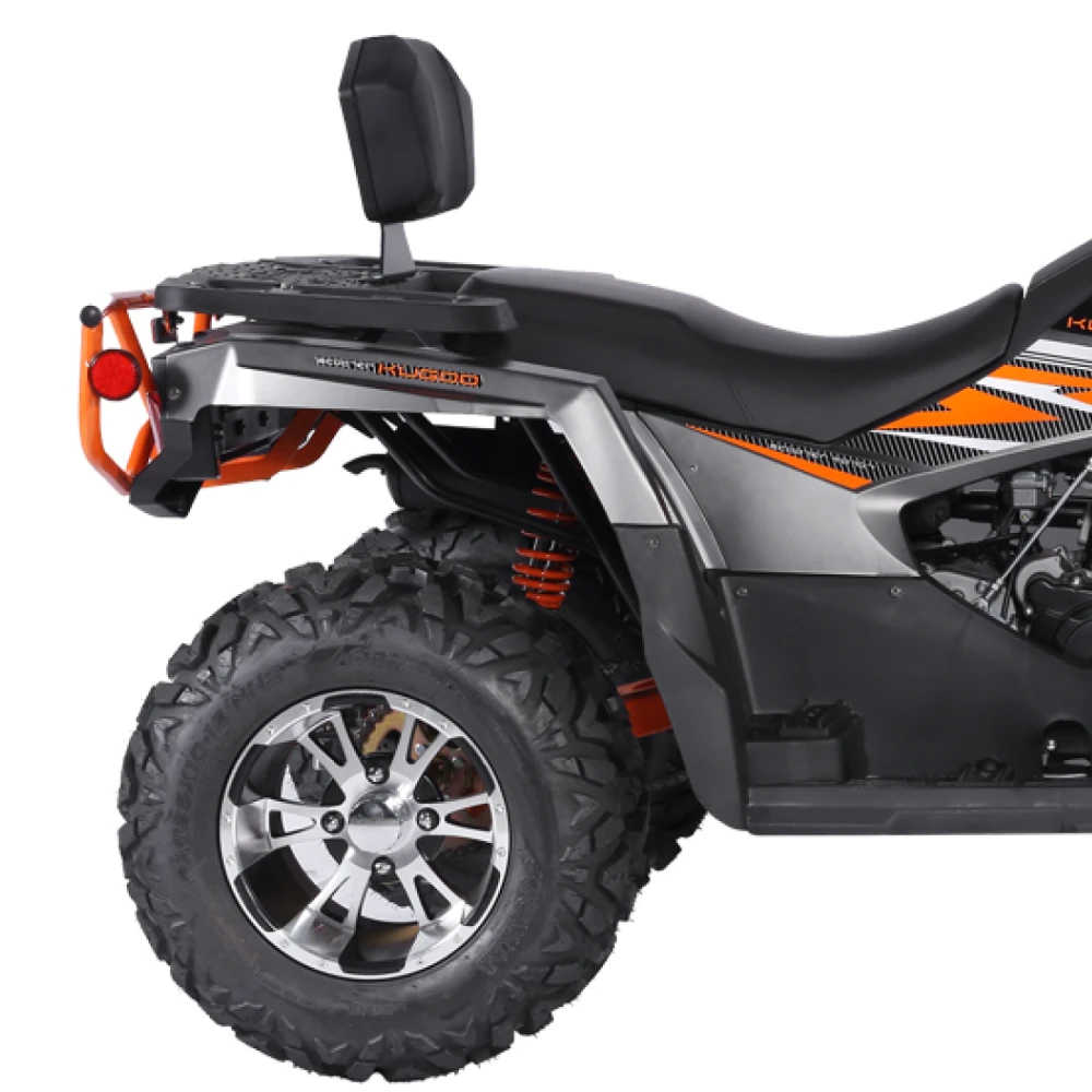 Под капотом Kugoo K5 скрывается производительный бензиновый двигатель объёмом 300 куб. см, выдающий 13,5 кВт мощности и 22 Нм крутящего момента. Это позволяет квадроциклу уверенно разгоняться, преодолевать сложные участки и сохранять стабильную тягу даже на крутых подъёмах до 15 градусов.