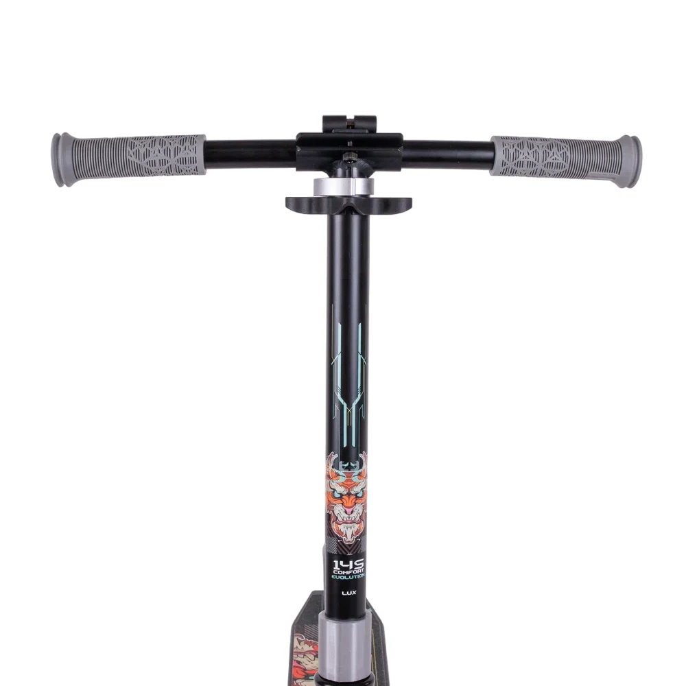 Самокат Tech Team Comfort 145 Lux Evolution 2024 черный – это сочетание стиля, функциональности и высокого качества. С весом в 3.75 кг, он идеально подходит для активных детей. Диаметр колес 145х30 мм с подсветкой обеспечивает плавное и безопасное катание. черная рама и грисы подчеркивают стильный дизайн, а бирюзовые колеса добавляют яркость. Складная конструкция позволяет легко хранить и переносить самокат. На деке изображен демонический красный тигр, что придает самокату индивидуальный характер. Встроенная подсветка деки, отличительная черта Lux версии, делает катание еще более увлекательным и заметным. Подшипники ABEC 7 обеспечивают плавное скольжение, а регулируемая высота руля (82-91 см) подходит для детей от 5 лет и роста от 110 см. Этот самокат – это не только средство передвижения, но и выразительный аксессуар для молодых и смелых райдеров.