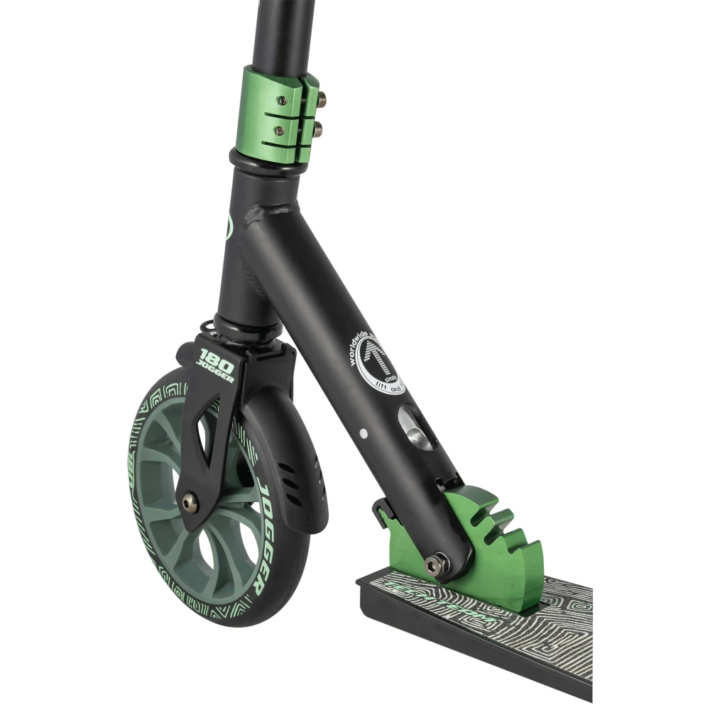На руле самоката имеется крепление для ремня, позволяющее носить его в руках. Черно-зеленый цвет самоката будет стильно смотреться и не оставит никого без внимания.