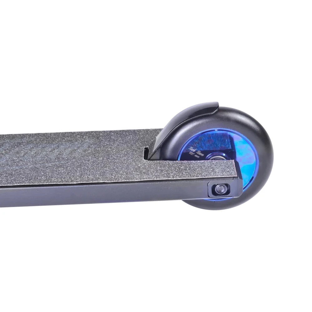 Небольшой вес самоката, удобный руль и надежная дека являются главными критериями безопасности выполнения трюков и маневрирования на дорогах. Рулевая часть имеет высоту руля 65 см. При необходимости может корректироваться до нужного размера. Изготовлена из хромолибдена. Внешний вид хрупкий и агрессивный одновременно. Самокат рассчитан на пользователей с параметрами роста 170-185 см, что подтверждает возможность пользования средством подростками и взрослыми.