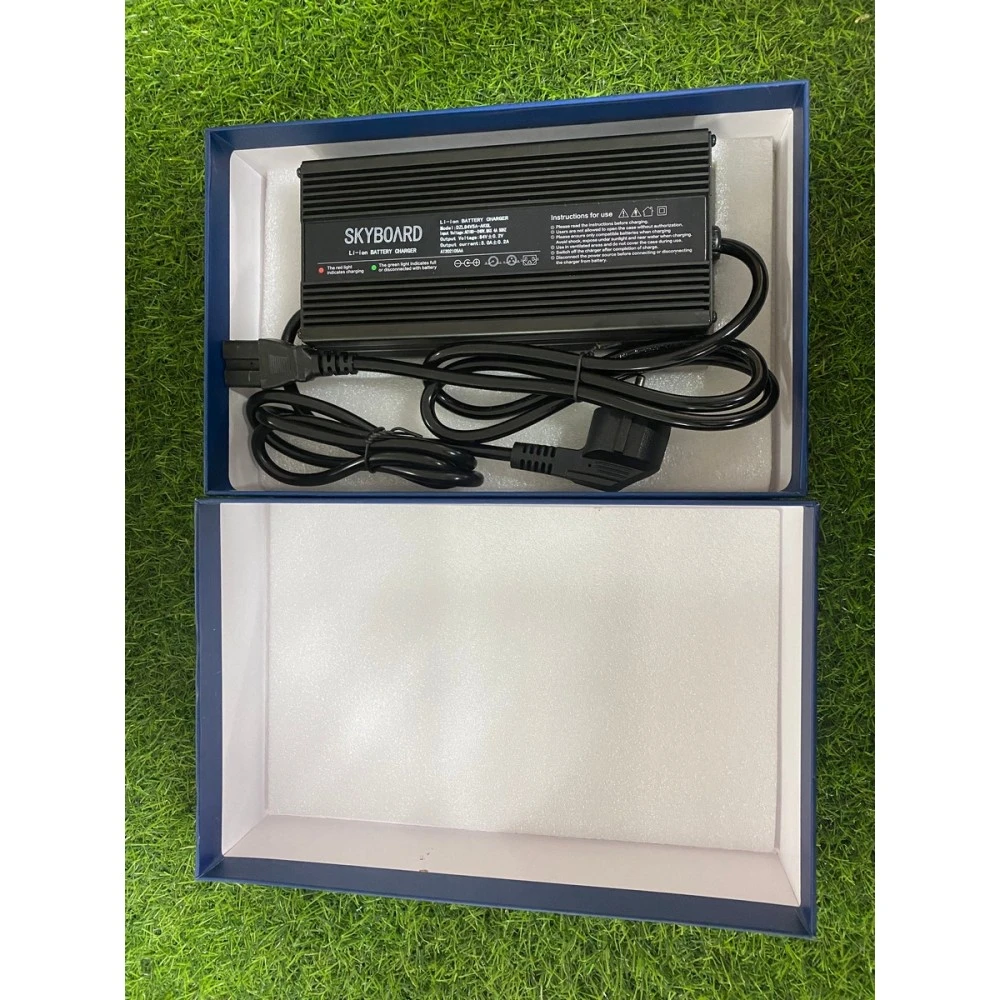 Зарядное устройство для Skyboard 72V 5A - оригинальное зарядное устройство преимущественно чёрного цвета. Изготовлено из ударопрочных материалов, что позволяет смело использовать при зарядке электросамоката, не боясь внешнего воздействия. Прорезиненый кабель также предотвратит скольжение его в ладони,  что не мало важно в определённых условиях труда либо погоды, а также имеет достаточную длину, чтобы без труда включить штекер в розетку.